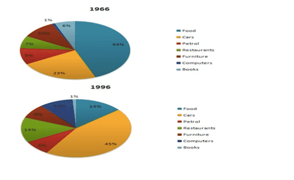 As is presented in the pie charts, in 1966, the lion’s share (44%) part of the income was spent on foodstuff. Whereas, merely 14% of income spent on meals, in 1996. In the case of cars, nearly a quarter of expenses went on it, in 1966. But after three decades, its expenditure went doubled. The consumption of petrol was more or less similar in both years. Both restaurants and furniture’s expenditure by the masses were 7% and 10% respectively, in 1966.