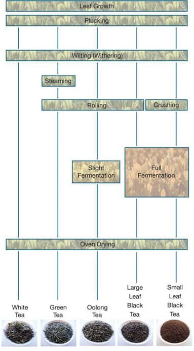 The given diagram elucidates the manufacturing of 5 different types of tea (white tea, green tea, oolong tea, large leaf black tea, and small leaf black tea).