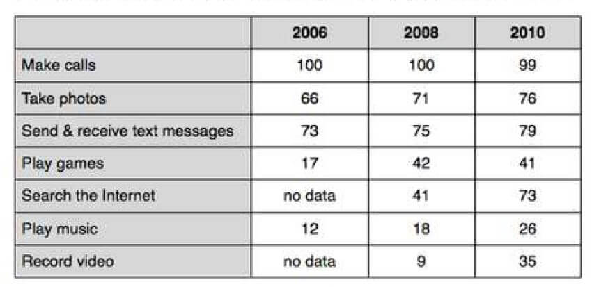 The table gives information about the proportion of people who use mobile phones with different kinds of features during three periods.