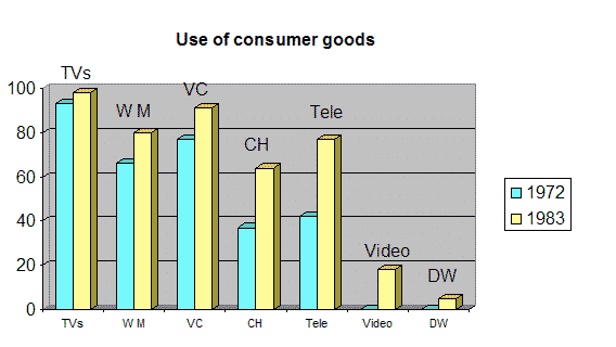 Moreover, the same trend was followed by the use of vacuum cleaner, if compared with the latter one with a minimal rose in both the years. Almost one – third families used central heating it increased steadily to 63% in the last year as same as in the case of television, the utilized was fourfold and 77% in the initial year and in the last year orderly. People did not show interest in the to buy videos and dishwashers at the beginning of the Year so, the rate was almost negligible, but in the following years 18% of folk used videos and 5% dishwashers.