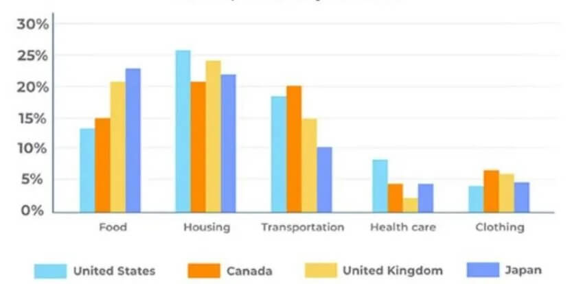 The given bar graph demonstrates the percentage of costs such as food, household, transportation, healthcare, and clothing in the United States, Canada, The United Kingdom, and Japan in 2009.