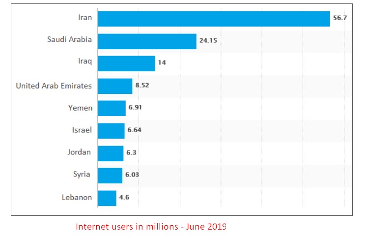 In June 2019, the internet usage for Iran was highest at 56.7 million, followed by Saudi Arabia, which was less than half of Iran at 24.15 and three fourth was Iraq at 14 million. The United Arab Emirates, on the other hand, had 8.52 usage, lagging was Yemen with 6.91 million. Israel, Jordan and Syria were almost identical, but Israel had a lead by half a million comparatively. Among all the nine middle east countries, Lebanon was found to have minor usage, which was just 4.6 million.