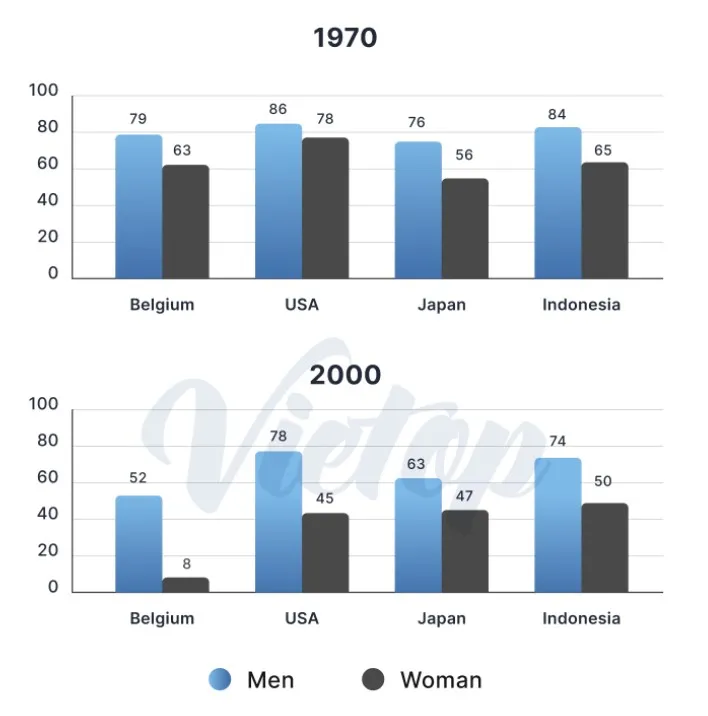 By contrast, it was seen in 2000. Belgium has the lowest women ratio with 8% comparative to men with 52%. Whereas, the USA has also been seen a decrease in the number of women with 45% to men with 78%. Following, Indonesia women with 50% to men with 74%. But, Japan has little fluctuations men with 63% to women with 47%.