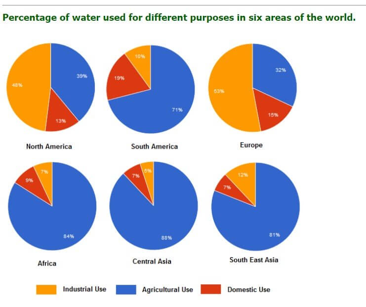Sample Answer: The Charts Below Show the Percentage of Water Used for Different Purposes in Six