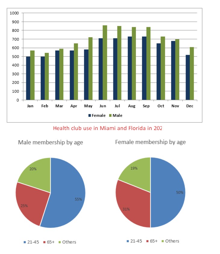 The graph below shows all full-time members’ average monthly use of health clubs in Miami and Florida in 2017. The pie charts show the age profile of male and female members of this health club. Summarise the information by selecting and reporting the main features, and make comparisons where relevant.