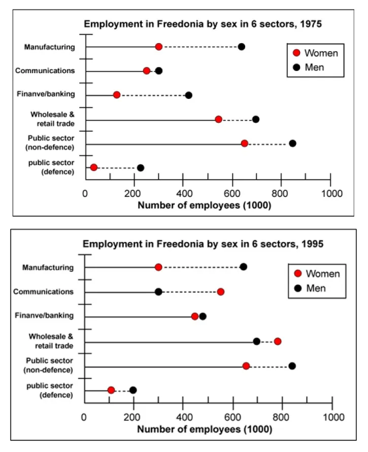 The graphs illustrate the number of employment in Freedonia by sex in six sectors between 1975 and 1995.