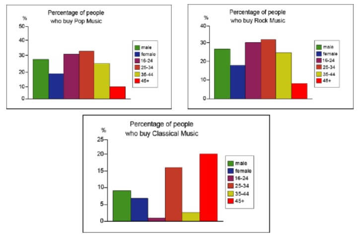 The following bar graphs illustrate the type of music albums bought by people in Britain based on their gender and age categories. The graphs compare three kinds of music albums which are pop music, rock music and classical music.