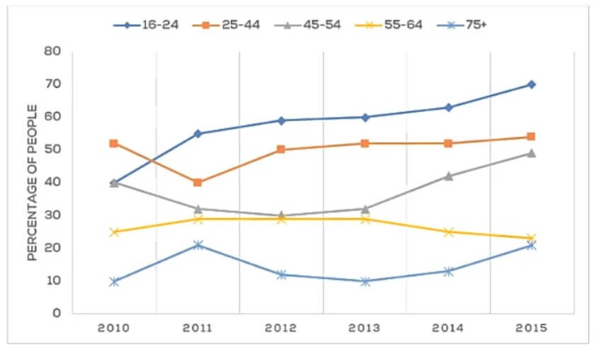 The Line Chart Shows the Percentage of People of Different Age Groups in The City Who Attended Music Concerts Between 2005 and 2015. Summarise the Information by Selecting and Reporting the Main Features and Making Comparisons Where Relevant.