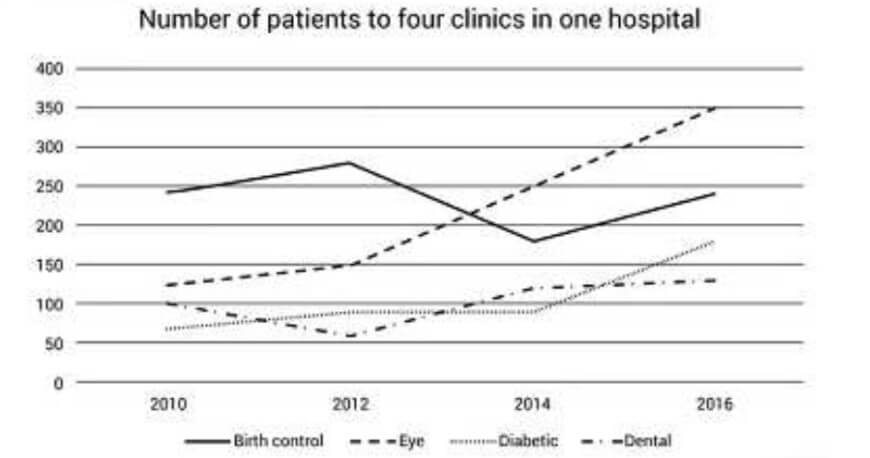 The line graph illustrates the number of patients who visited the four different health centres (birth control, eye, diabetic, and dental) between 2010 and 2016.