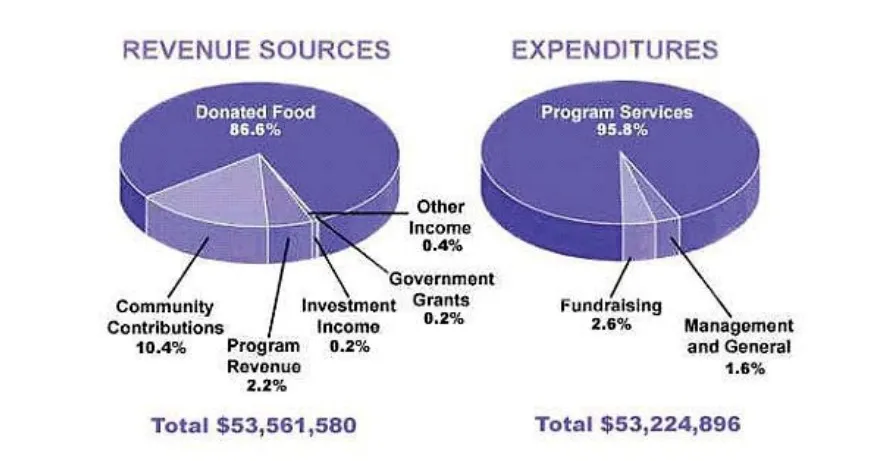 Looking at the information in more detail, 86.6% of revenue was collected from donated food. Moreover, 10.4% were accepted through community contribution and 2.2% from program revenue. In addition, government grants and investment income raise some amount of income, around 0.2%, and 0.4% through other resources.