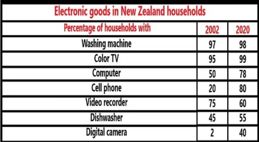 The Table Below Shows the Percentage of Household and Electronic Goods in New Zealand in 2002 and 2020. Summarise the Information by Selecting and Reporting the Main Features and Making Comparisons Where Relevant.