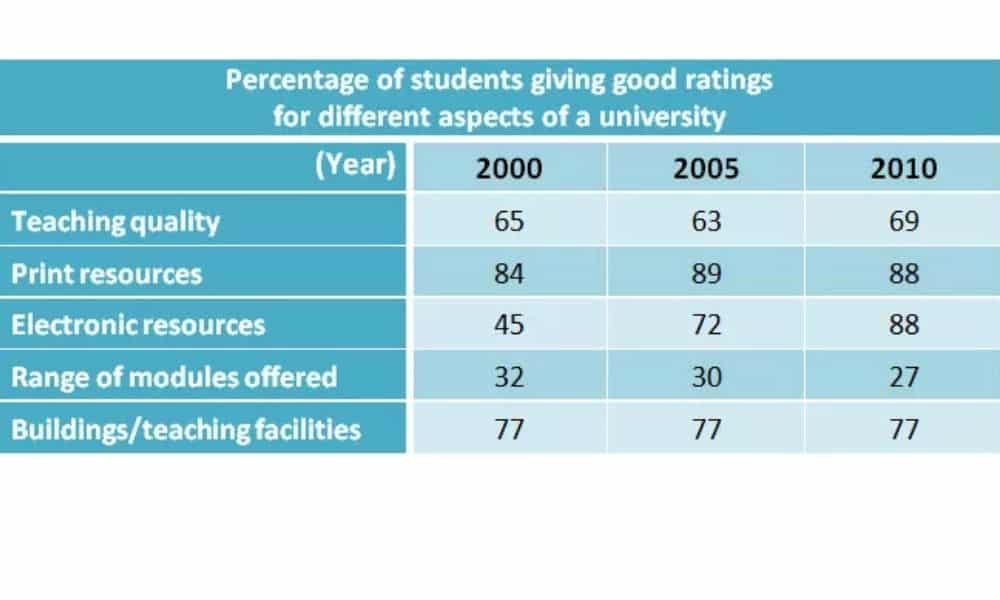 The table provides information about student’s satisfaction with the quality of teaching and learning support of a university in the years 2000,2000 and 2005 respectively. The survey focuses on the 5 main features, namely on teaching quality, print resources, electronic resources, range of modules offered, and building or teaching facilities.               (IELTSData Twitter)