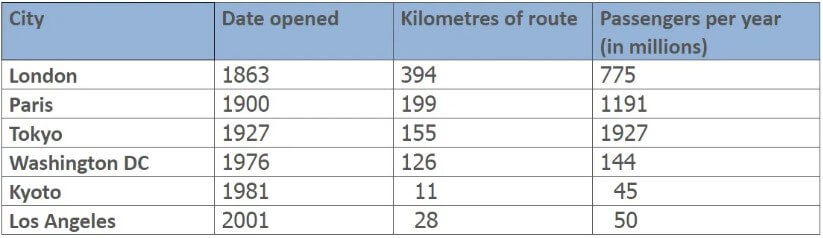The tabular chat enumerates the information regarding the underground railway in six different cities, the distance of the route and the number of passengers per year in millions. The data has been calibrated in numbers.