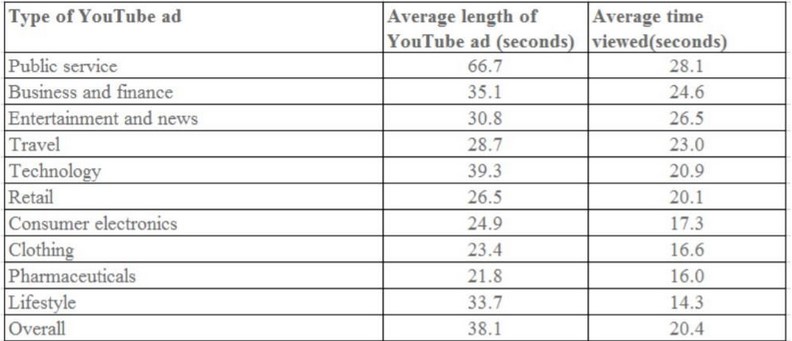 The table shows the average length of YouTube video advertisements and the average length of time viewers spend watching them. Summarise the information by selecting and reporting the main features.