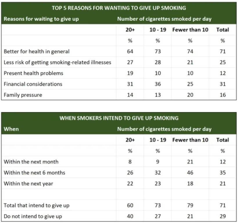 According to the second table, the majority of smokers questioned (71%) intended to give up, with light smokers more inclined to quit(79%) than heavy smokers (60%). 35% of smokers said they were planning to give up within the next 6 months, and only 12% said they were prepared to try within the following month.